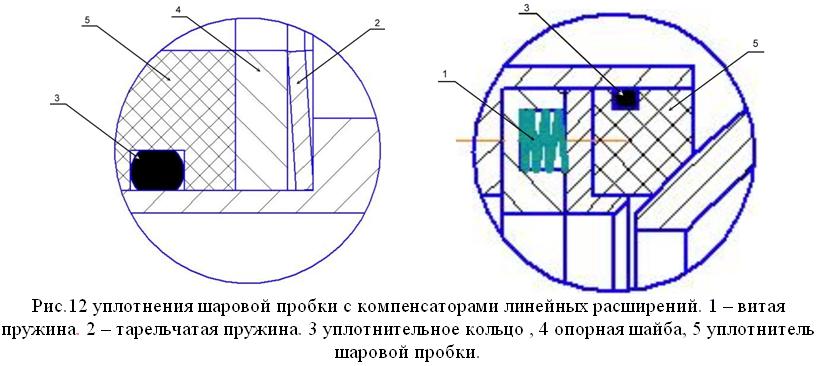 Добрый день, скидываю Вам эскиз уплотнения шаровой пробки. На первом рисунке показана система с тарельчатой пружиной, на втором с системой витых пружин. Первый вариант широко распространен на кранах до DN150, второй DN более 150. Подобное Вы увидите на наших кранах, НАВАЛе, Баламаксе, ВЭКСВЭ и т.д.