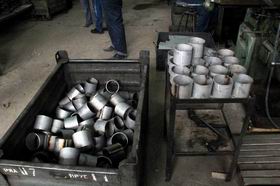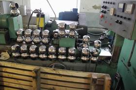 Данный способ получения шаровой пробки заключается в обжимке из распиленных пакетов трубы(как правило нержавеющих - хром и молибден содержащих сталей) сферических заготовок. После обжатия заготовки отправляют на отпуск в печи, для снятия напряжений сферической заготовки. После отпуска в печи, пробку отправляют на проточку черновыми резцами на сферотокарных станках. После прохода на более точном токарном оборудовании уже блестящий шар отправляется на шлифовку и полировку. В данном случае на заводе "Олбризсервис" производится полировка методом прогона в специальных вибро-ваннах с абразивным материалом. Простота данного процесса заключается в том, что присутствие человека-оператора в данном процессе минимально и объм отшлифованной пробки будет равен количеству вибро-ванн.