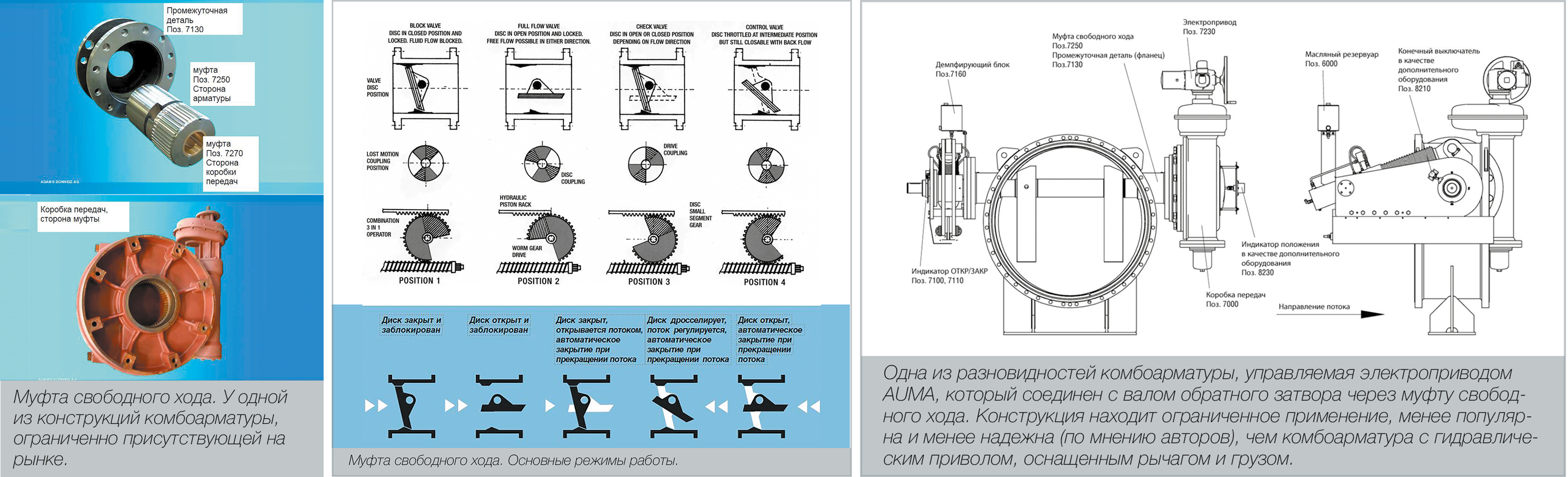 Автор статьи лично сам впервые столкнулся с комбоарматурами лет 16–17 назад, когда на московскую ТЭЦ-26 были поставлены комбнированные затворы Ду1000 Ру25, отличные от классических с гидравлическим приводом с ручагом и грузом. Приводная часть у них осуществлялась электроприводом AUMA, а переключение между режимами принудительного открытия, закрытия и автоматического предотвращения обратного потока происходило за счет муфты свободного хода.
