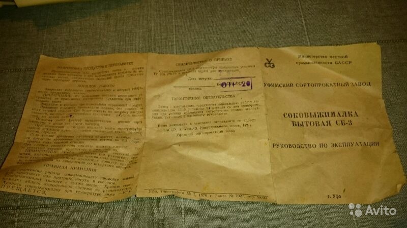 118.77 КБ, Просмотров: 42577 Re: Кто узнает производителей? / ТЗ Уфа. Уфимский сортопрокатный завод. Соковыжималка СБ-3. 1977. Фото2. С avito.ru.jpg
