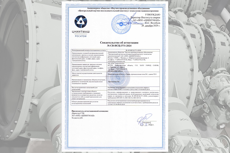 По результатам аттестационных испытаний АО «НПО «ЦНИИТМАШ» оформлено и выдано свидетельство об аттестации № СВ-ИСЦ-37/1-2024 от 26.12.2024 г.