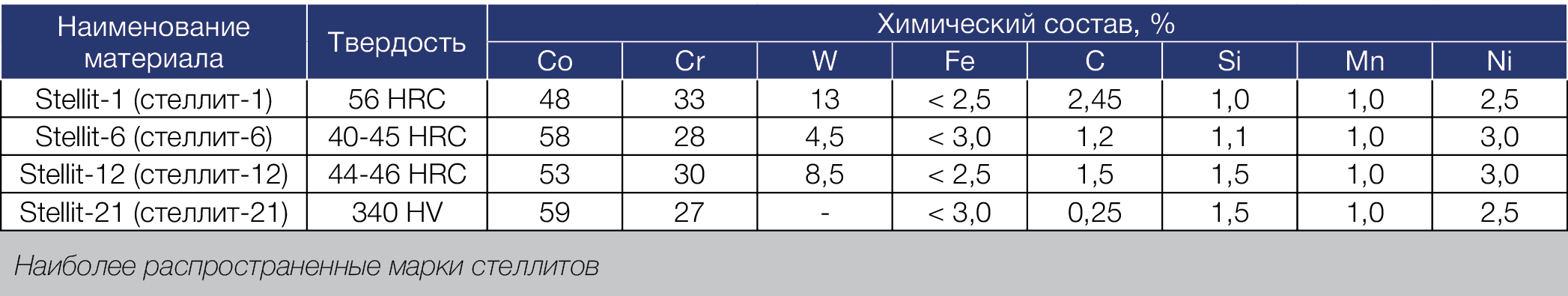 Это современные износостойкие материалы для сварки и наплавки на кобальтовой основе, широко известные как стеллиты (Stellite – торговая марка Kennametal Inc., USA). Стеллиты – группа литых твердых сплавов на основе кобальта и хрома с добавками вольфрама и/или молибдена для напыления, наплавки и напайки деталей машин, оборудования, инструмента с целью повышения их прочности и износостойкости. Основные свойства стеллитов, определяющие сферу их применения, – ударопрочность, жаростойкость свыше 1000 °С, высокая коррозионная стойкость. Существует несколько стран-производителей данных материалов, среди них США, Германия. КНР и другие.