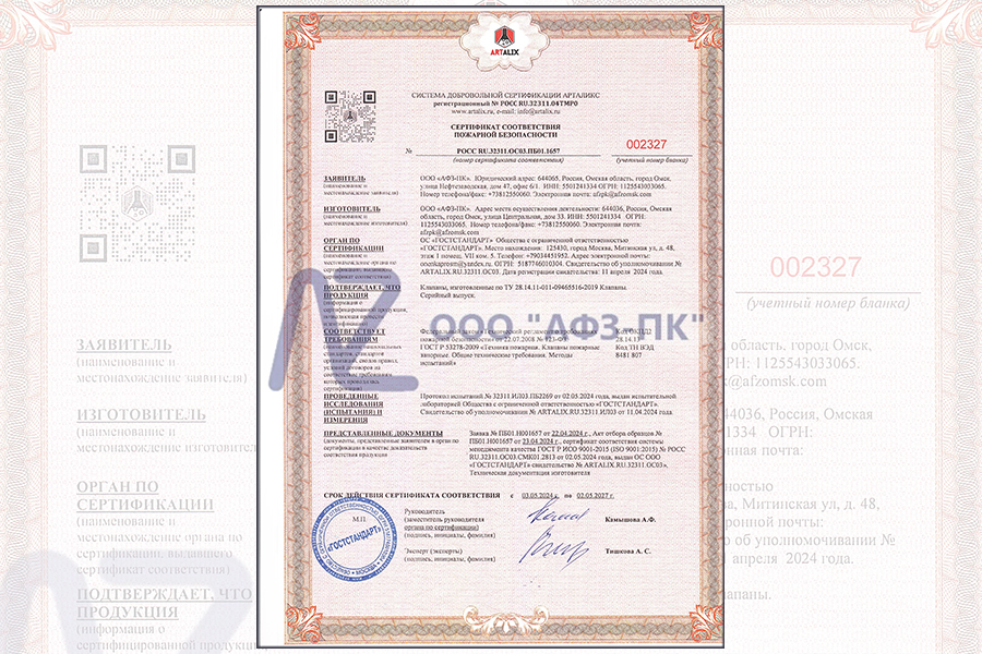 Органом по сертификации выступило ООО «Гостстандарт». Документ подтверждает, что клапаны «АФЗ-ПК», изготовленные по ТУ 28.14.11-011-09465516-2019 (серийный выпуск), соответствуют требованиям ФЗ «Технический регламент о требованиях пожарной безопасности» от 22.07.2008 № 123-ФЗ. ГОСТ Р 53278-2009 «Техника пожарная. Клапаны пожарные запорные. Общие технические требования. Методы испытания».