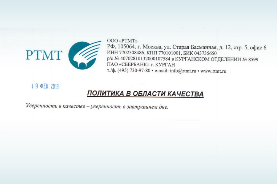 Данная политика является основополагающим руководством для всего персонала ООО «РТМТ». Благосостояние всех членов коллектива компании зависит от уровня качества и конкурентоспособности производимой продукции. Политика в области качества тесно взаимосвязана с кадровой и социальной политикой ООО «РТМТ».