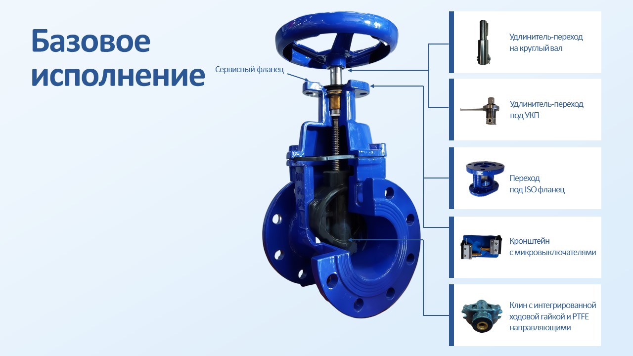 Задвижки во всех конфигурациях могу быть дооснащены заглушкой внутренней полости клина для защиты подвижных частей механизма от крупных механических включений.