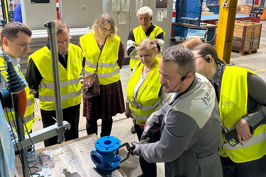 Экскурсию по заводу провёл менеджер по продукту Алексей Татаринов. Гостям показали полный цикл: как из чугунной заготовки получается готовая к эксплуатации прошедшая контроль качества задвижка. А также Алексей продемонстрировал, что именно стоит за фразой «гарантия качества», показав группе метод, которым проверяют толщину покрытия только что изготовленного изделия — «ударно-искровой тест».