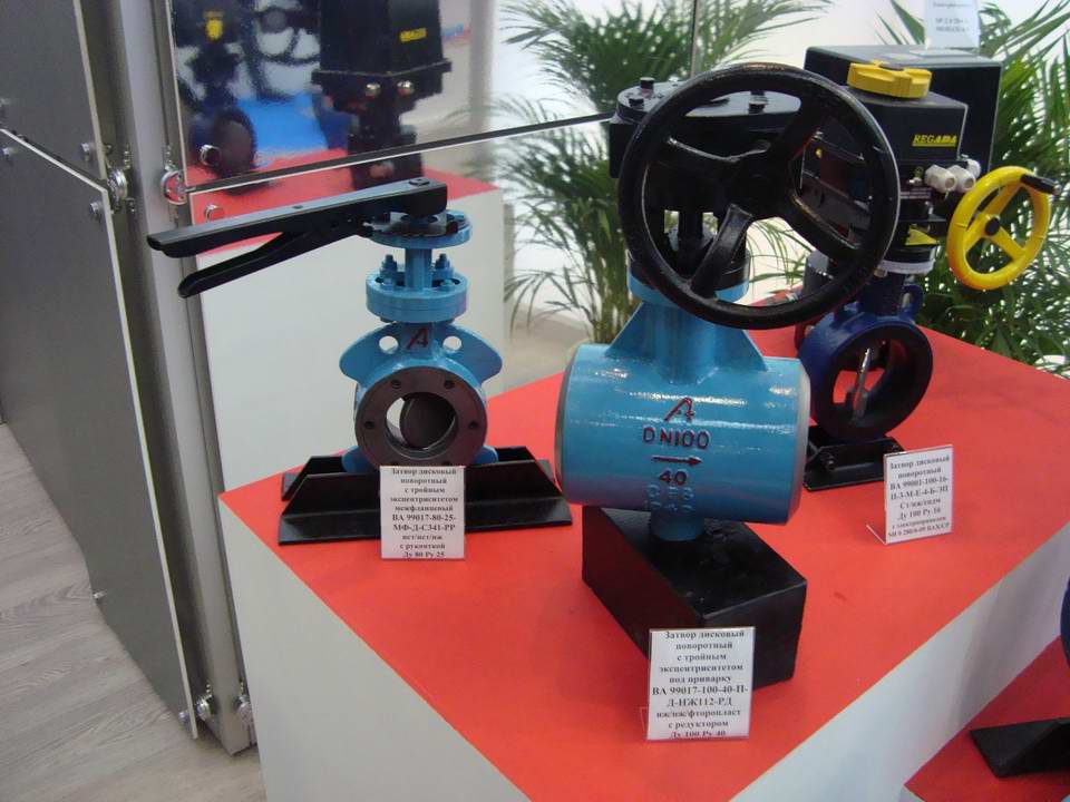 На стенде также присутсвовали поворотные дисковые затворы называемых среди Арматурщиков - бабочки. Были представлены затворы с обозначением ВА 99001-100-16 Ду100 Ру16 с электроприводом фирмы Regada SH0 280-0-09, имеющий конструкцию ст/нж/епдм. Также были показаны два варианта больших диаметров поворотников - ВА 99001-300-10 с конструкцией ст/нж/нитрил диаметром 300 мм и давлением 10 кгс с ручным управлением и его чугунный аналог на Ду250 мм и давлением 10 кгс с установленным пневмоприводом