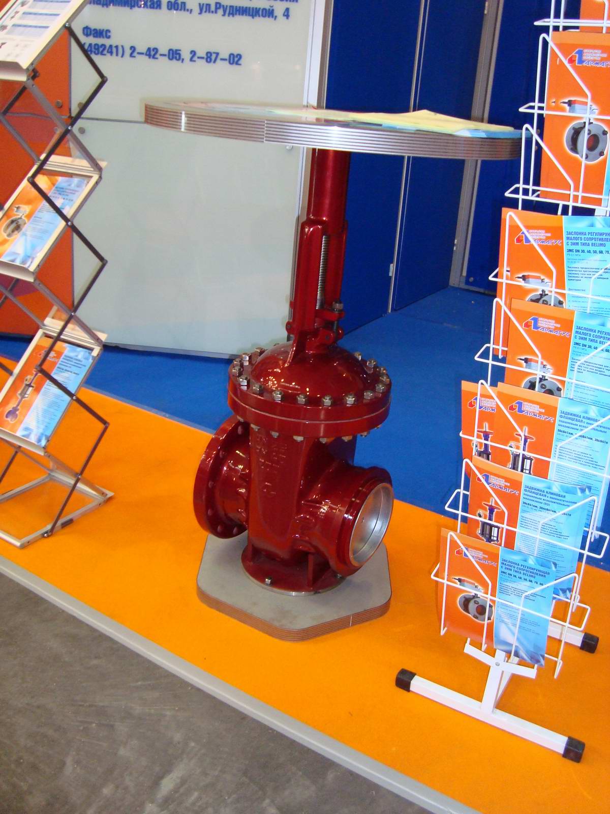 Отдельного внимания на стенде заслужила красочная задвижка, служащая одновременно показательным образцом и достаточно удобным столом :) Под такую идею была использована вантузная задвижка с выдвижным шпинделем Dn200 PN25/40 используемая для установки на технологических линиях нефтегазодобывающей промышленности, которая в настоящая время производится заводом.