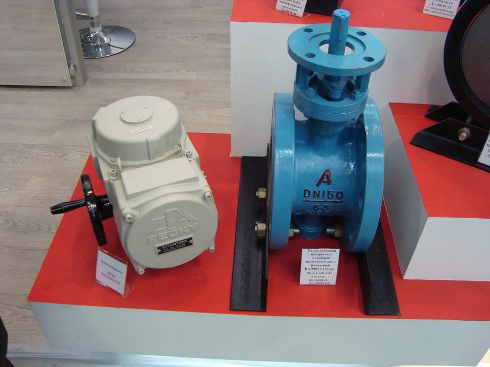 На стенде также присутсвовали поворотные дисковые затворы называемых среди Арматурщиков - бабочки. Были представлены затворы с обозначением ВА 99001-100-16 Ду100 Ру16 с электроприводом фирмы Regada SH0 280-0-09, имеющий конструкцию ст/нж/епдм. Также были показаны два варианта больших диаметров поворотников - ВА 99001-300-10 с конструкцией ст/нж/нитрил диаметром 300 мм и давлением 10 кгс с ручным управлением и его чугунный аналог на Ду250 мм и давлением 10 кгс с установленным пневмоприводом