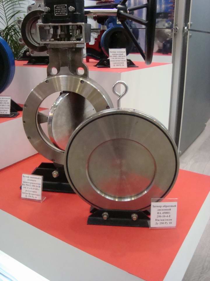 Кроме описанных выше затворов были выставлены и дисковые обратные затворы. Тонкая модель ВА 45001 250-10-4-Е Ду250 Ру10 имеющая конструкцию нж/нж/епдм представлена на фото, рядом с ней раположился затвор с двойным эксцентриситетом ВА 99012-25-16-11 Ду250 Ру16 в комплекте с редуктором Pro-Gear и конструкцией нж/нж/фторопласт.