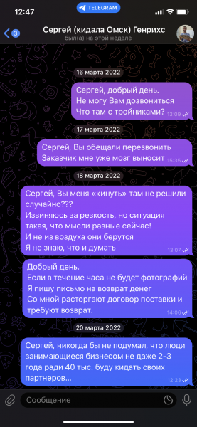 Суть такая: работали несколько раз с 2017 по 2020 гг., вносили предоплату (обычно 50%) – он изготавливал, доплачивали и он отгружал. Проблем особо не было, по мелочи можно придраться, но я не придирчивый. И вот в марте 2022 года, когда уже началось то, что началось (форс мажор не прокатит из-за событий)… пришла мне заявка от заказчика и я не мог найти по адекватной цене, а работать как-то нужно, рынок вообще шатает в разные стороны… ну думаю раз работали ранее то запрошу и у него, он выставил счет, я спросил за скидку, согласовали и… время то не стабильное было, мало ли что, не очень большая сумма и решил сделать предоплату 100% и оплатил. Прошел срок отгрузки, я спрашиваю и что? И где товар? Ну и вот тут началось: сломался якобы пресс, надо ждать, а уже ждать куда, если и так просрочка…, я предложил сделать возврат, он согласился на словах, отправил письмо – нет ответа. Позвонил ему – он ответил, что письмо видел, но денег нету, будут другие заказы и он сразу вернет… ну и всё)) после на телефон уже не отвечал, возврат не сделал.