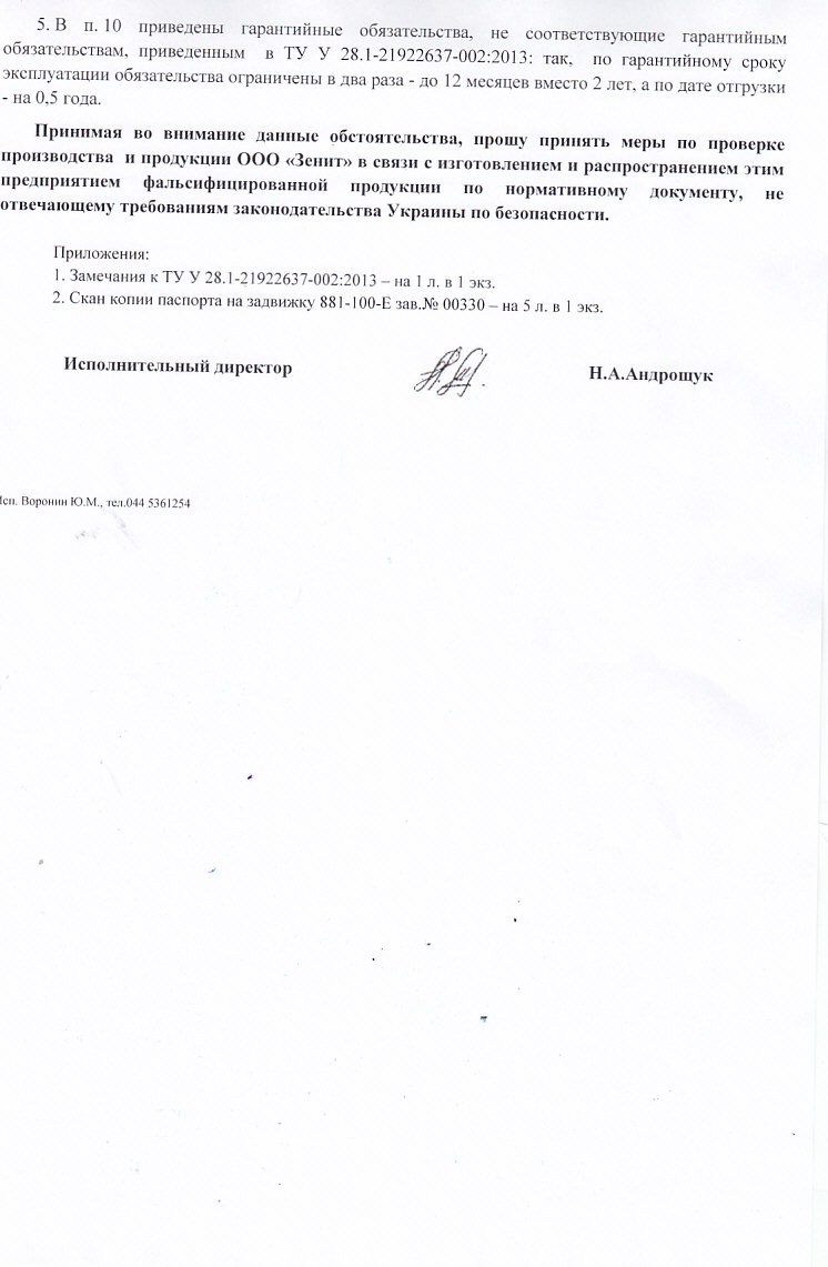ООО "Зенит" утверждает, что является производителем энергетической трубопроводной арматуры, при этом предоставляя фиктивное "слепленное" на скорую руку ТУ, в котором представлены задвижки от самых простых канализационных на низкое давление до энергетической арматуры сверхвысоких параметров (давления и температуры).