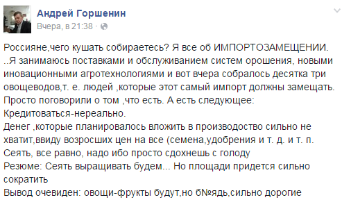 "Импорт заместит импорт, тут даже вариантов не может быть. Другое дело, что он придет по другой цене, с другими документами. Есть позиции, которые заменить достаточно сложно. Полки не останутся пустыми не потому, что так утверждает правительство и Медведев, а просто, если останутся пустые полки, то разорятся магазины, неважно – большая сеть или маленькая продуктовая лавка. Операционные издержки никто не снизит из-за того, что мы ввели санкции против зарубежного фермера, аренда резко не упадет, налоги не отменят, работники торговли от зарплат не откажутся. Когда они [покупатели] приходят в магазин, все заканчивается одним: покупатели выбирают по ценам. И по этому критерию выбирают они в основном товары транснациональных корпораций. Поэтому рассказы о том, что они проявляют пищевой патриотизм, – это пустая болтовня. Когда эти люди утверждают, что берут местное молоко, они забывают, что оно упаковано не во что-нибудь, а в тетрапак шведского производства, выработано из зарубежного сухого молока, оборудование немецкое или голландское. <…> Мы любим поговорить о том, что уж картошку-то с селедкой мы поедим. Вообще-то, надо вспомнить, что посевной материал – то, из чего выращивается картошка, у нас он, извините, на 90% голландский. Ингредиенты для наших пищевых продуктов на 80% европейские или из США. Поэтому говорить слово «отечественный товар», мягко говоря, некорректно, отечественного товара нет уже 20 лет. Его надо очень долго возрождать. Сначала в научно-исследовательских институтах. Только после этого может что-то появиться. Лет двадцать надо заниматься тяжело и упорно. Кто-то считает, что сейчас-то мы займемся. А что нам мешало последние два десятилетия этим заниматься?" (Полный тест интервью http://www.svoboda.org/content/article/26530520.html).
