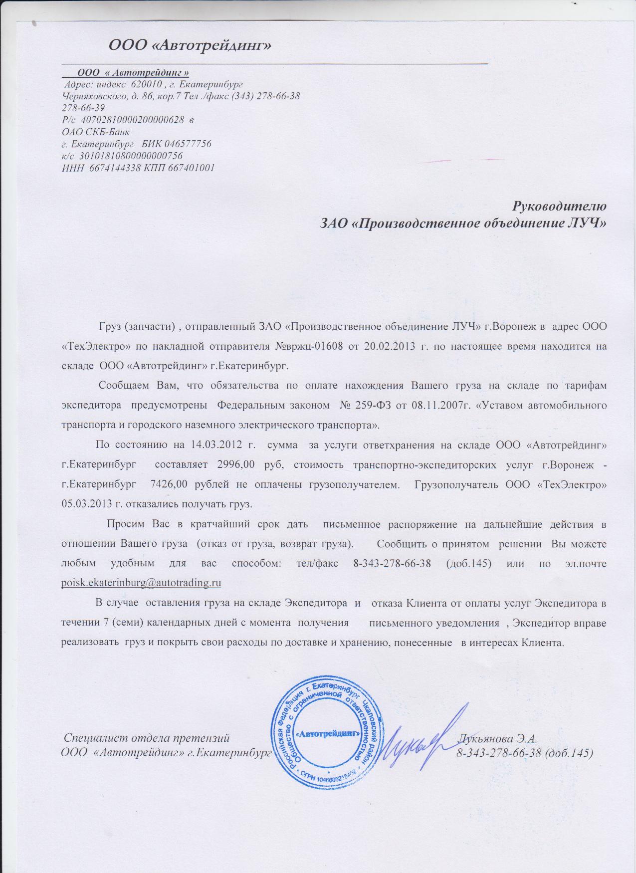 В общем обманули нас на 750т.р. , это только денег , без учета потери деловой репутации, транспорта и пр. … (в данный момент прошло уже пол года, но вопрос не закрыт) Всем кто интересуется, в подтверждении слов, готовы направить подписанные договора, счета, договора с транспортниками, которые два раза в пустую ждали товар в Воронеже и прочее предоставим … Все комментарии по телефону (343) 2190455