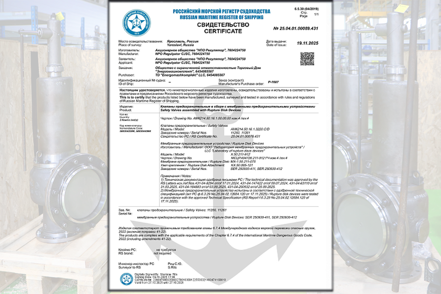 Предприятие «НПО Регулятор» получило от Российского морского регистра свидетельство о соответствии предохранительных клапанов в сборе с мембранными предохранительными устройствами DN50 PN16 требованиям Международного кодекса морской перевозки опасных грузов (МКОПОГ).