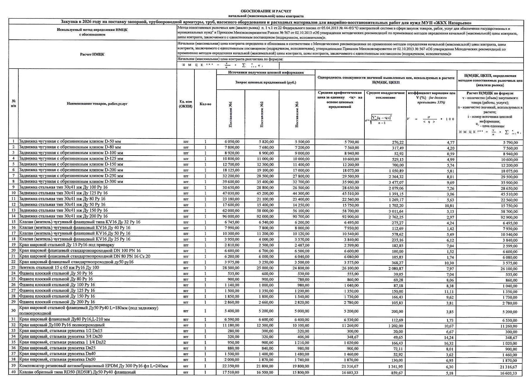 Объект закупки: Закупка в 2026 году на поставку запорной, трубопроводной арматуры, труб, насосного оборудования и расходных материалов для аварийно-восстановительных работ для нужд МУП «ЖКХ Назарьево»