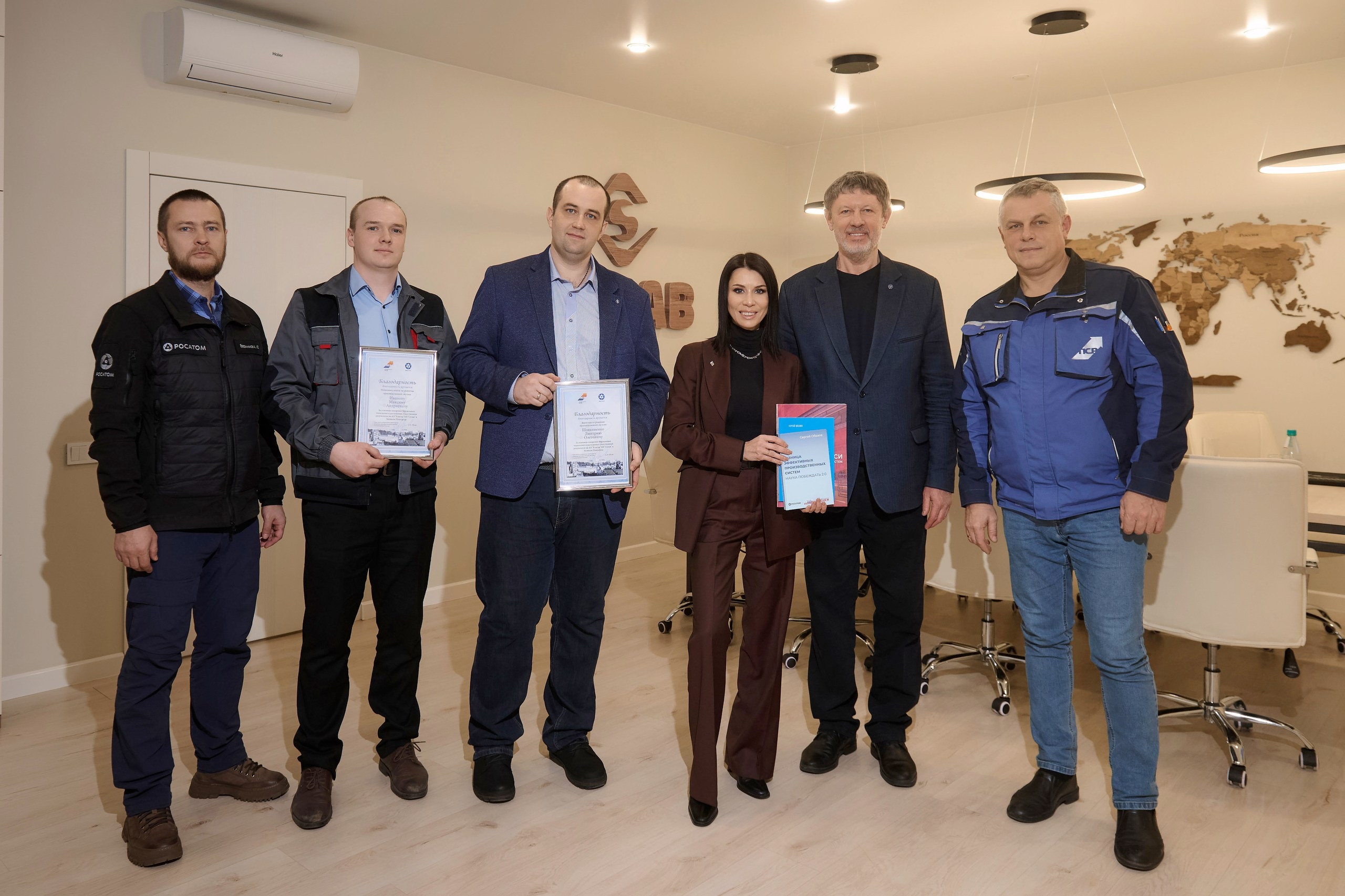 За успешное внедрение бережливых технологий и достижение Корпорацией «Сплав» существенных результатов Сергей Обозов вручил благодарности ГК «Росатом» и АО «ПСР» директору по развитию производственной системы МК «Сплав» Дмитрию Шовковенко и начальнику отдела по развитию производственной системы Максиму Иванову.