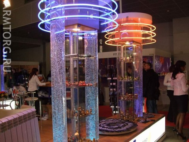 Между колоннами с неоновой подсветкой с пузырьками расположились шаровые краны